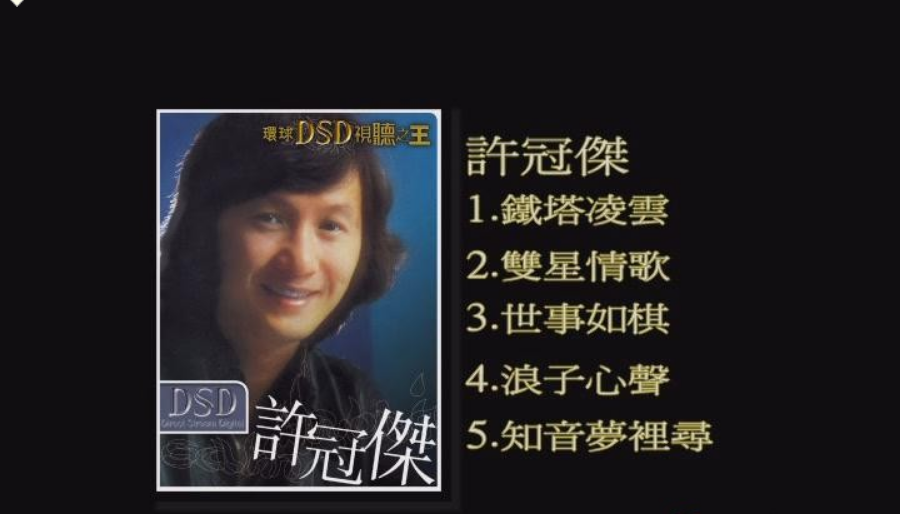 环球DSD视听之王-许冠杰(DVD-ISO 971M) 音乐专辑 《环球DSD视听之王:许冠杰》是环球唱片出版的粤语专辑,专辑歌手是许冠杰。中文名称:环球DSD视听之王–许冠杰专辑语言:粤语专辑歌手:许冠杰唱片公司:环球唱片DVD曲目:1.铁塔凌云2.双星情歌3.世事如棋4.浪子心声5.知音梦里等资源下载下载价格10 金币立即购买环球许冠杰