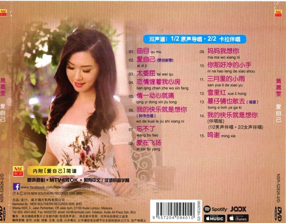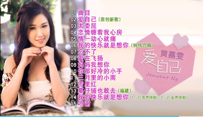 黄嘉雯 – 爱自己 2018 Karaoke 卡拉OK [DVD ISO 3.45GB] 音乐专辑01.曲目 02. 爱自己(原创新歌) 03. 太委屈 04. 恋情缠着我心房 05. 情一动心就痛 06. 我的快乐就是想你(钟伟合唱) 07. 忘不了 08. 爱在飞扬 09. 妈妈我想你 10. 你那好冷的小手 11. 三月里的小雨 12. 雪里红 13. 墓仔铺也敢去(福建) 14. 我的快乐就是想你(伴唱版)(audio 1 男声/audio 2女声伴唱) 15. 鸣谢 资源下载下载价格10 金币立即购买2018爱自己黄嘉雯