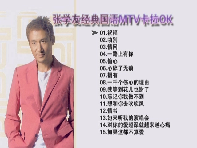 张学友:经典国语MTV卡拉OK》学友那悦耳、低沉而混厚的音质让人听后感觉非常舒服,再加上他声音中那潜在的爆发力,难怪红透三地无人可及。如果你懂,一切尽在音乐中,学友总是给我们一首一首的好歌,爱的苦涩酸甜在学友的款款轻唱中是那么的感人至深,也许这让我们有了点思考,体味动人的音乐,也许影响和改变了一生!