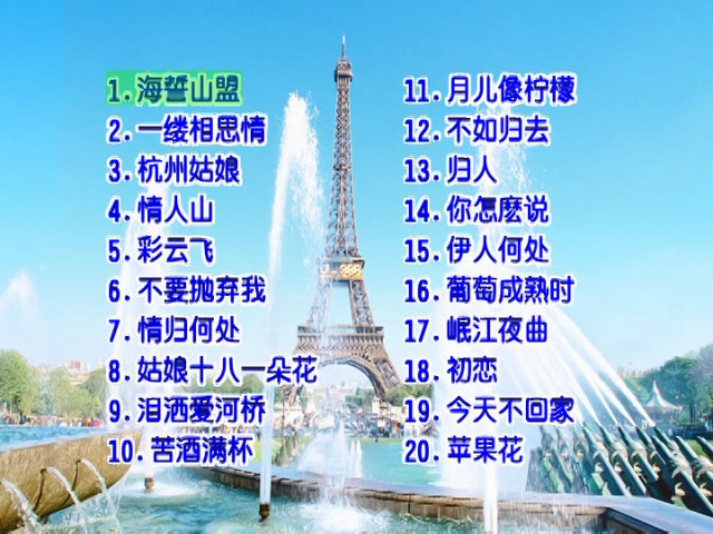 林玉英 – 钢琴酒吧专辑四 卡拉OK [DVD ISO 4.32GB] 音乐专辑钢琴酒吧四 01.海誓山盟 02.一缕相思情 03.杭州姑娘 04.情人山 05.彩云飞 06.不要抛弃我 07.情归何处 08.十八姑娘一朵花 09.泪洒爱河桥 10.苦酒满杯 11.月儿像柠檬 12.不如归去 13.归人 14.你怎么说 15.伊人何处 16.葡萄成熟时 17.岷江夜曲 18.初恋 19.今天不回家 20.苹果花 资源下载下载价格10 金币立即购买林玉英钢琴酒吧