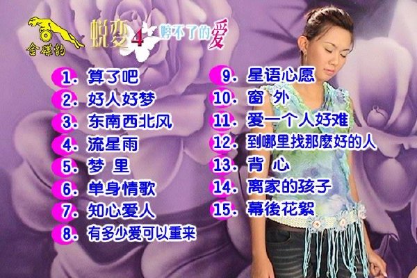 卓依婷大胆尝试从民歌曲风,转变为成熟细腻、流行动感的走向,精挑细选中国流行曲和当红的歌曲,卓依婷唱出不同原唱的曲风与唱腔,”蜕变”就是代表着依婷的成长与转变,喜欢依婷的朋友一定要完整收藏。